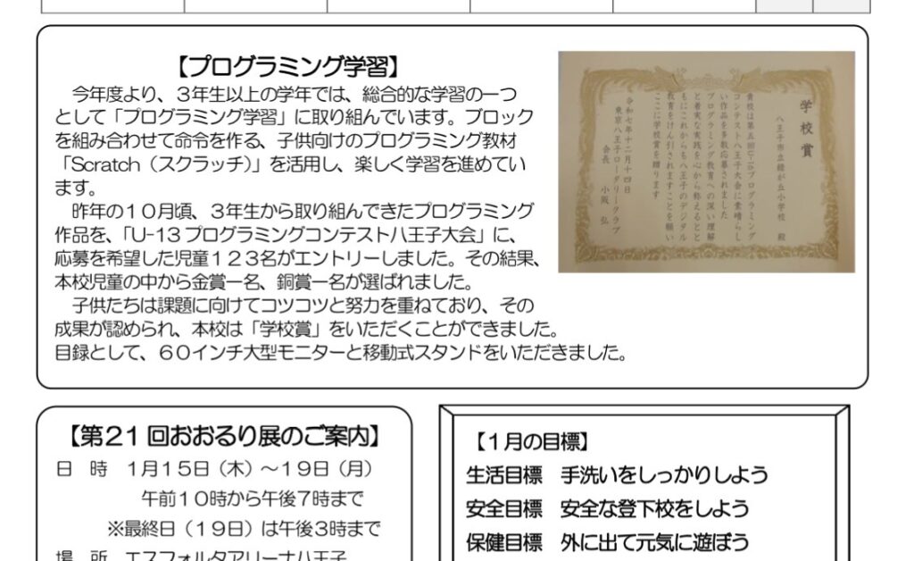 八王子市内の小学校(全69校)における「情報教育」を力強くサポートする為に、特に熱心に情報教育を行った小学校を3校ピックアップして表彰するものです。